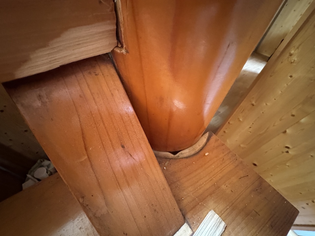 階段吹抜部分の2階腰の梁上の壁下地がずれて、壁が膨らんでいます。